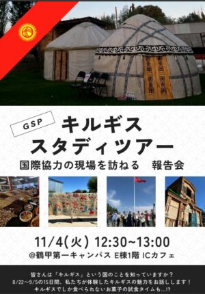 今年の夏休みの2週間、GSPとしてキルギスに渡航した学生たちが、現地の体験を交えながら、自然豊かで人々のおもてなし文化の根付くキルギスの魅力をお話します。